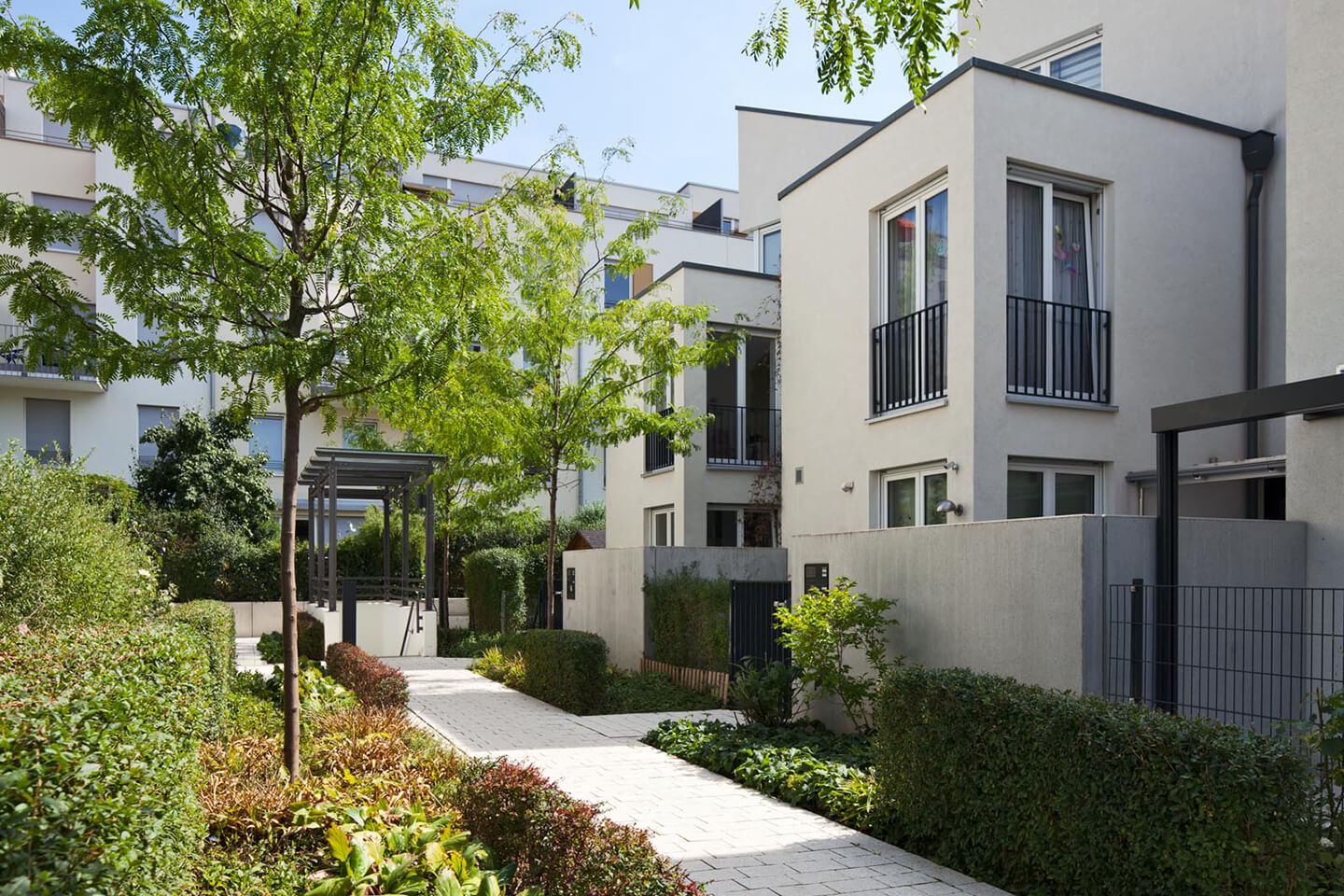 Jedes einzelne Baufeld verfügt über besonders gestaltete Grünanlagen mit kleinen gemütlichen Quartiersplätzen.
